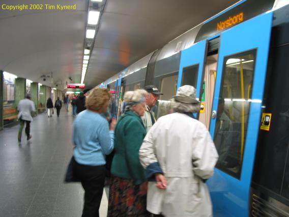 On the northbound track wall at Karlaplan is this extensive work of photographic art by Larseric Vänerlöf called "Den dagen den sorgen," or in English, "Don't borrow trouble," depicting events in Sweden during the 1900s. This photo only shows part of the work; it's almost as long as the platform.
